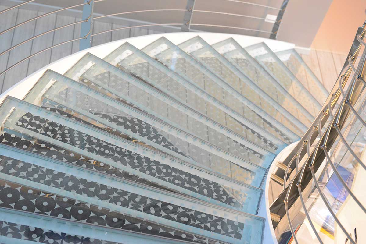 Veneto Vetro produces glass for interiors with a wide range of processes according to the specific needs for each project, in accordance with the customer’s taste: slipproof floor glass, antiglare and scratchproof glass for floors and walls, satin finished glass, wired glass, screen printed glass, printed glass for parapets, stairways and partitions, safety glass and armoured glass for doors and windows. Veneto Vetro acts as a landmark working with the design and architectural studios, and frame manufacturers, installers and floor layers.